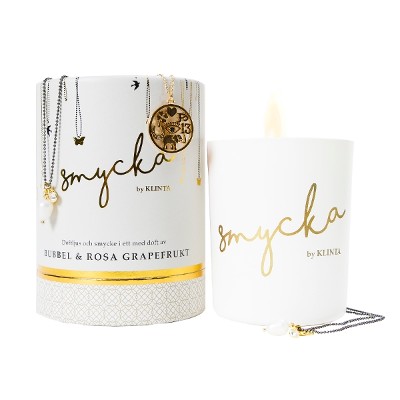 Herlig duftlys med et smykke i fra svenske Klinta. Oljen fra lyset kan brukes til alt fra massasje, hudpleie og aromaterapi. Det er bare å nyte og glede seg!